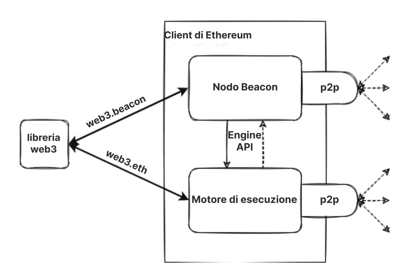 - Il client di consenso (noto anche come il Nodo Beacon, client CL o, precedentemente, client di Eth2) implementa l'algoritmo di consenso di proof-of-stake, che consente alla rete di raggiungere l'accordo secondo i dati validati dal client di esecuzione. C'è inoltre un terzo pezzo di software, chiamato "validatore" che può essere aggiunto al client di consenso, permettendo al nodo di partecipare alla messa in sicurezza della rete.