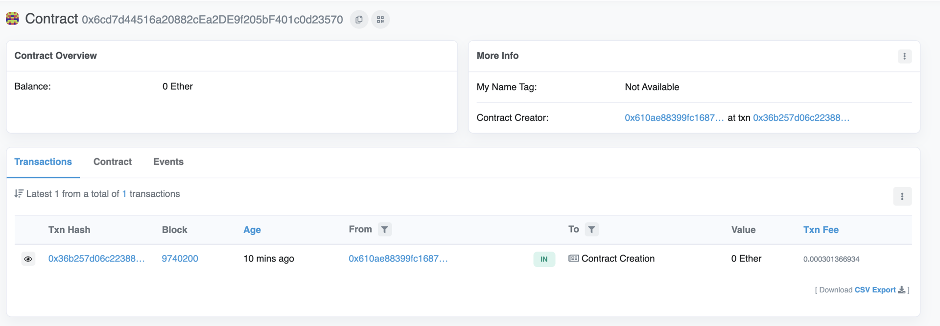 The From address should match your MetaMask account address and the To address will say Contract Creation. If we click into the transaction we’ll see our contract address in the To field.